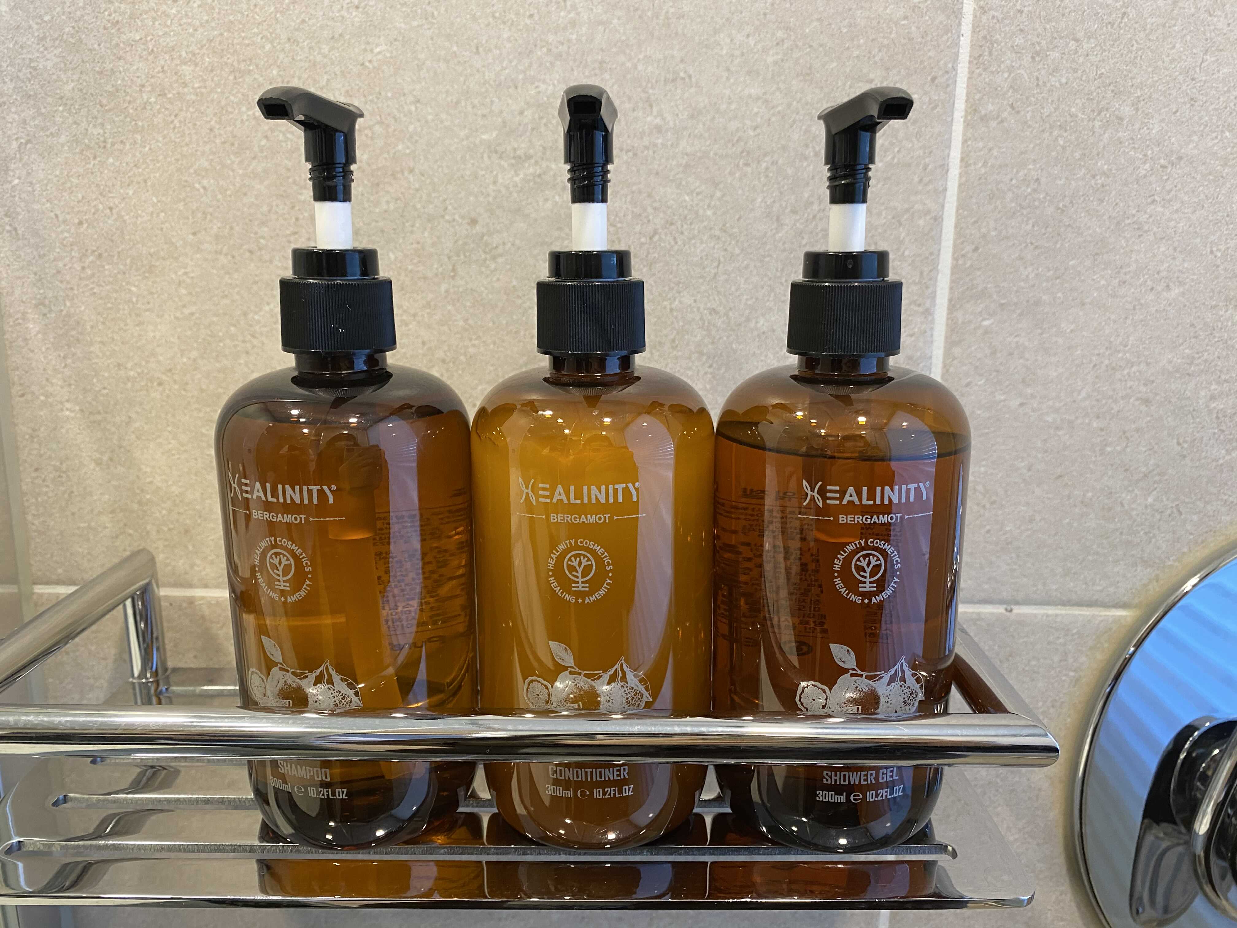 욕실에는 샴푸, 컨디셔너, 바디워시가 있고