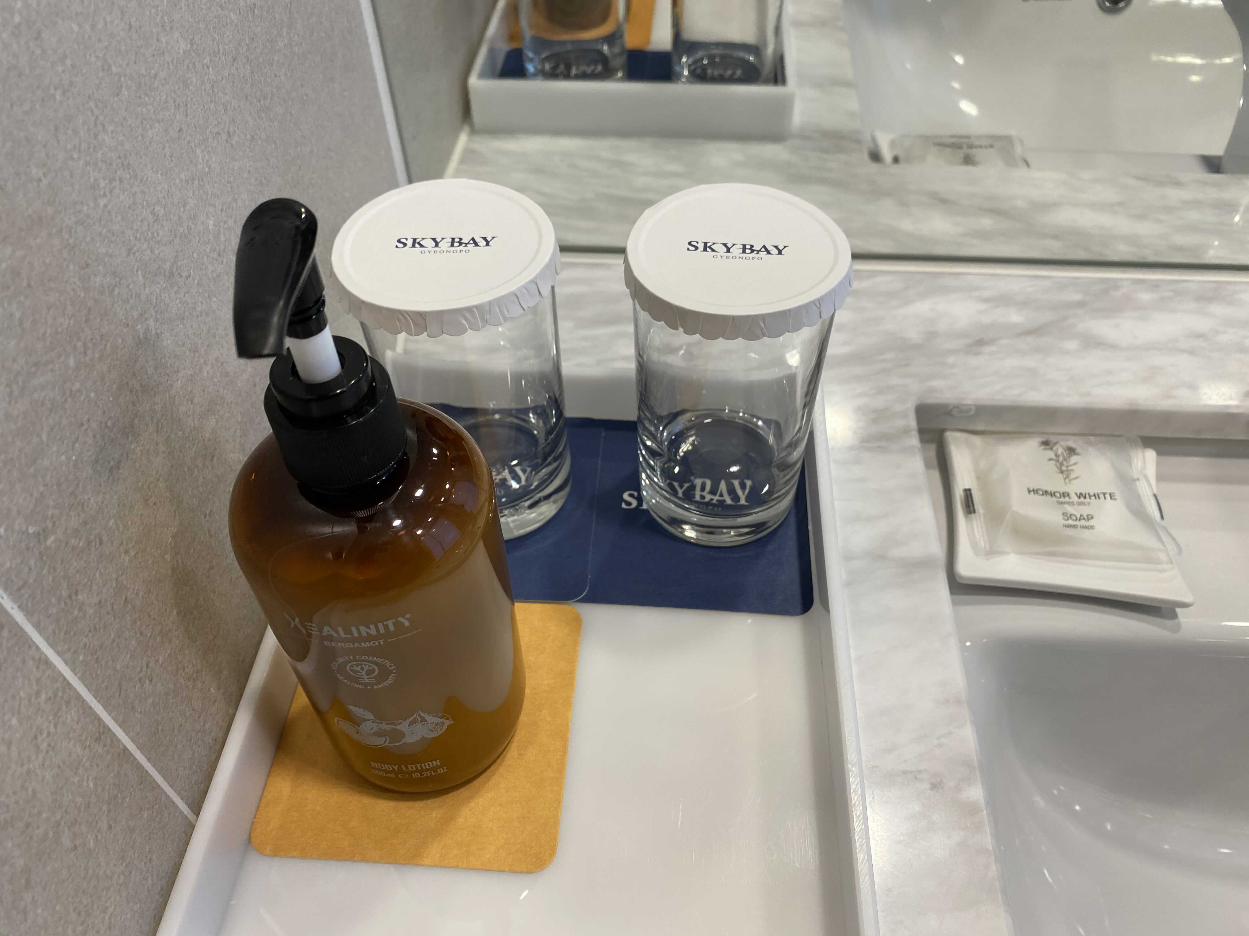 세면대 위에는 바디로션과 비누가 비치되어 있어요
